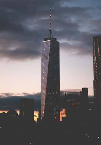 The image features a large skyscraper towering over a cityscape. The skyscraper is the main focus of the scene, with its impressive height and architectural design. The cityscape is bustling with activity, as evidenced by the numerous cars and trucks scattered throughout the area. In addition to the vehicles, there are several people visible in the scene, likely going about their daily routines. The combination of the skyscraper, the cityscape, and the people creates a lively and dynamic urban environment.
