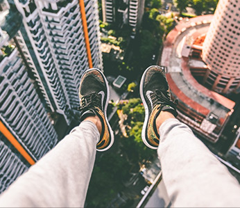 The image features a person wearing a pair of Nike shoes, standing on a skyscraper's edge with their feet dangling over the edge. The person appears to be enjoying the view from the top of the building. The scene captures the thrill of being high up in the air, with the person's shoes being the main focus of the image.