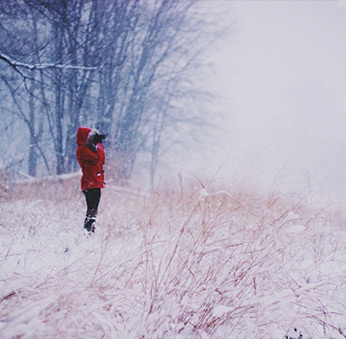 The image features a person standing in a snowy field, wearing a red jacket. They are holding a camera, possibly taking a photograph of the surrounding landscape. The person appears to be the main focus of the scene, with the camera capturing their interest in the environment. The snowy field provides a picturesque backdrop for the photograph.