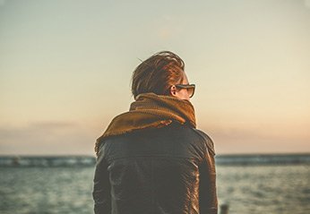 The image features a woman standing on a pier, looking out over the water. She is wearing a black jacket and has her hair pulled back. The woman is also wearing sunglasses, which adds a stylish touch to her appearance. The scene is set against a beautiful backdrop of the ocean, creating a serene and picturesque atmosphere.