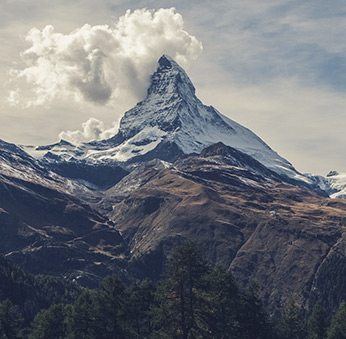 The image features a majestic mountain with a snow-capped peak, towering over the surrounding landscape. The mountain is surrounded by a lush forest, creating a picturesque scene. The mountain's peak is visible, standing tall and proud amidst the trees. The overall atmosphere of the image is serene and captivating, showcasing the beauty of nature.